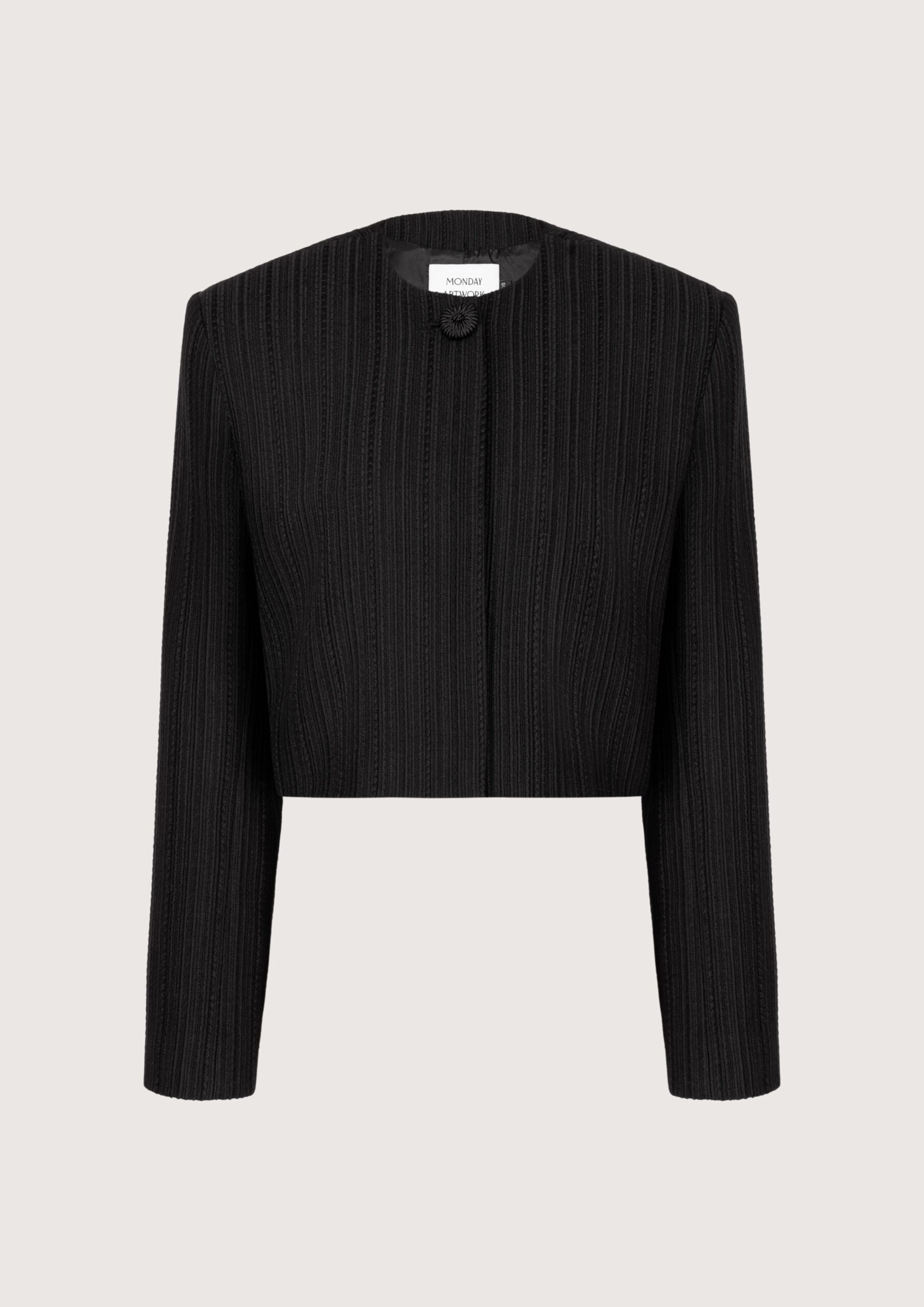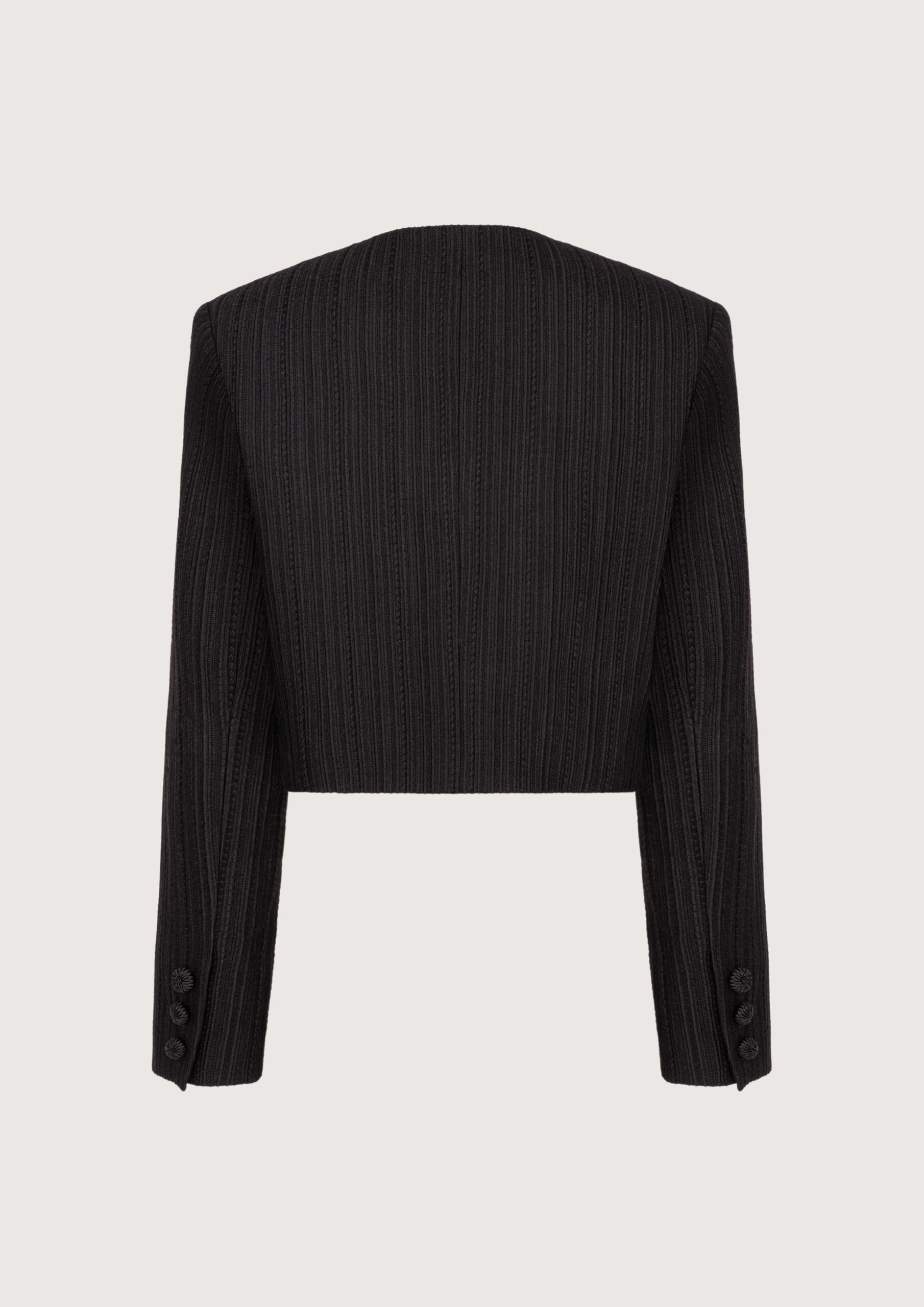 Krótka marynarka uszyta z eleganckiej, teksturalnej tkaniny w kolorze czerni. Ma dopasowany krój i ozdobne guziki, które dodają jej subtelnego, biżuteryjnego charakteru.