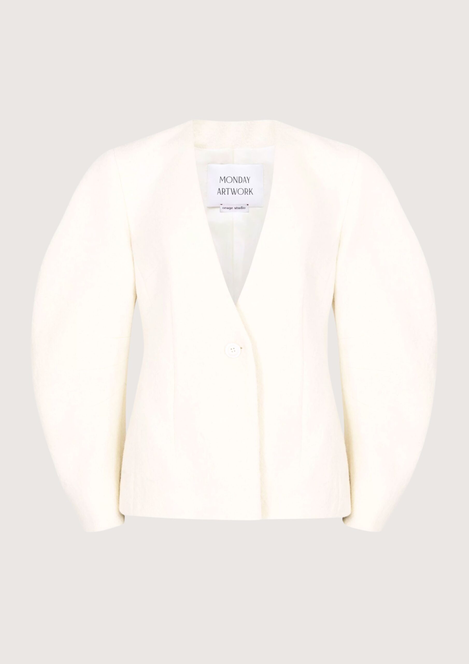 Taliowana marynarka uszyta z miękkiej wełny w odcieniu eleganckiej śmietanki. Inspirowana koszulą Yanina, zyskała subtelny dekolt w serek oraz charakterystyczne, lekko zaokrąglone rękawy.